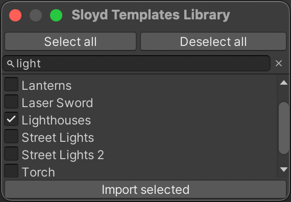 You can import any public 3D model generator available in Sloyd WebApp. In your Unity project go to Tools > Sloyd > Templates Library and choose the templates you want to work with.